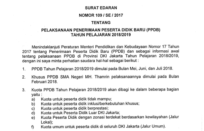 SURAT EDARAN NOMOR 109/SE/2017 TENTANG PELAKSANAAN PENERIMAAN PESERTA DIDIK BARU (PPDB) TAHUN PELAJARAN 2018/2019 Unduh di
